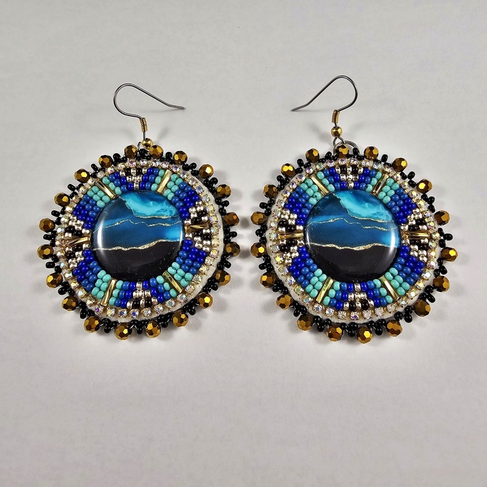Beaded Blue Rhinestone Earrings, Indigenous, Native American Beadwork