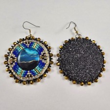 • Unique Design: The beadwork earrings hang about 2.5 inches from the top of the hook and about 2 inches at the widest spot.  It features a stunning faceted center piece, glass seed beads, Glass rhinestone chain and faceted glass crystal beads around the edge. Simple metallic gold beads finish off this stunning piece. The beads are meticulously tacked down every 2 for durability.  The piece is backed with a black glitter pleather. Its very sparkly and eye catching in the sun.